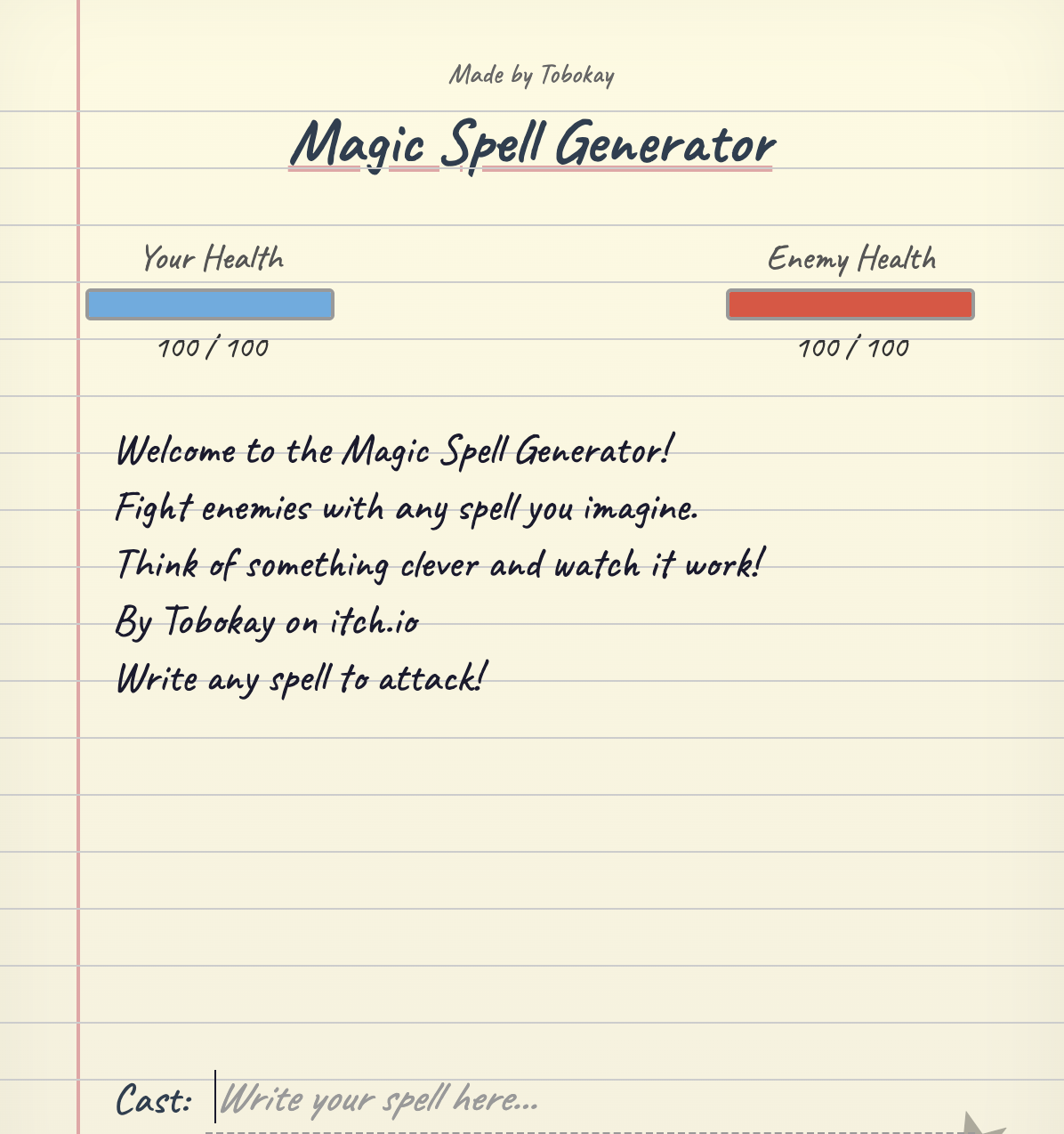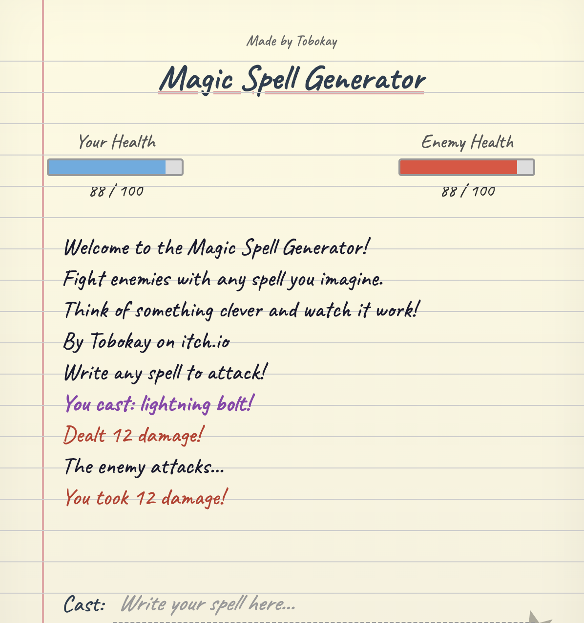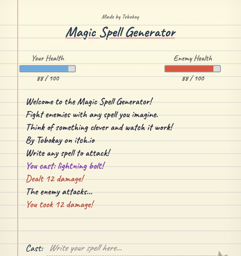 This is Magic Spell Generator. Simply type any spell you can think of into the text box and defeat the enemies! MSG is in beta release 1.0.0. More content and monsters in the future!
